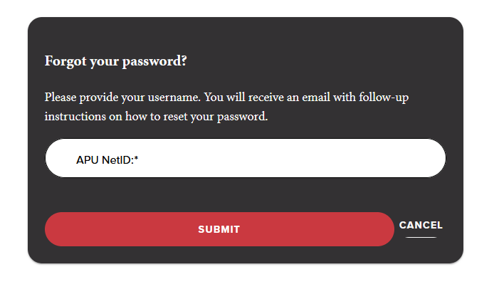 Please note that this method only works if you ARE LOGGED INTO your APU Account. You will NOT need your current password as you are already logged in.